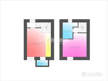 Al piano terra trovi la zona living, composta da salone e una cucina a vista, che crea un ambiente accogliente e luminoso. In aggiunta, c'è uno spazio ripostiglio che offre ulteriore comodità e sfruttabilità degli spazi. Al primo piano, invece, si trova la camera da letto, perfetta per accogliere un arredo confortevole, e un bagno che completa la zona notte.