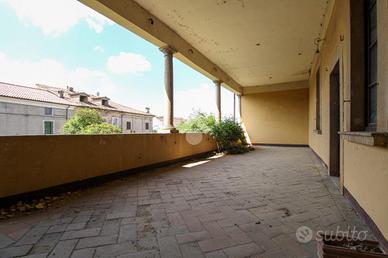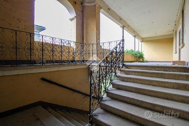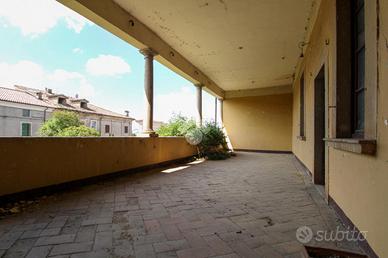 L'ampio porticato sopra descritto si affaccia su una porzione di corte interna avente una superficie di c.a. 252,30 mq; in lato nord, sul retro del complesso, è invece situata una seconda e più ampia porzione di corte esclusiva avente una superficie complessiva di c.a. 1.329,00 mq e con diritto di accesso da Via San Carlo.