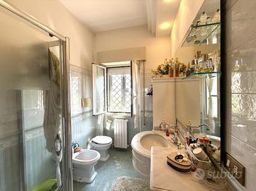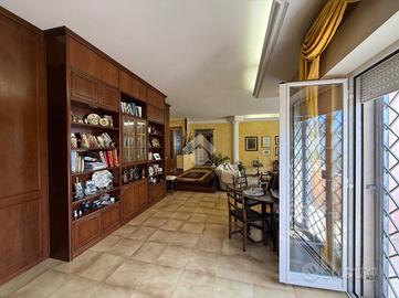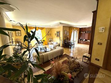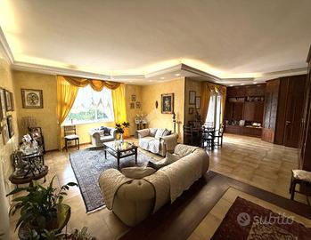 L'immobile si apre con un elegante salone di c.a. 40 mq, impreziosito da grandi vetrate che regalano una splendida vista sul verde del giardino, servito da una porta finestra che permette l'accesso al balcone privato.