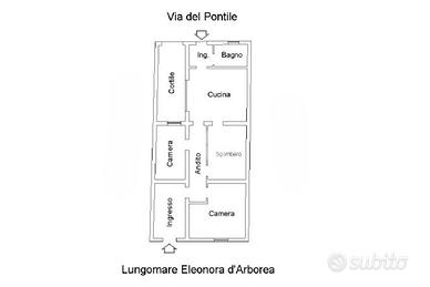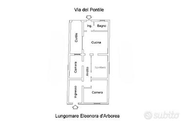 L'immobile dispone di un primo accesso dal Lungomare Eleonora d'Arborea che conduce a un disimpegno dal quale si accede a tutti gli ambienti. La zona giorno è composta da un soggiorno con angolo cottura, con uscita diretta sul cortile interno, ideale come spazio riservato e vivibile.