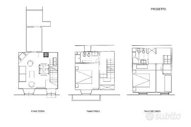 La soluzione è così disposta: entrando troviamo una zona giorno con camino e angolo cottura salendo al primo livello è presente una camera matrimoniale e un bagno, mentre nel secondo e ultimo livello troviamo un'ulteriore camera matrimoniale e una cameretta. Possibilità di creare un secondo bagno.