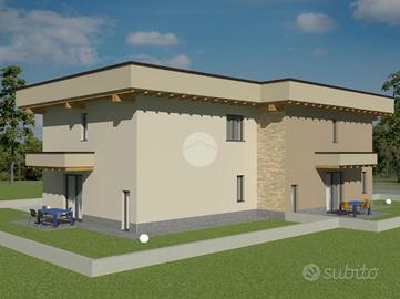 Proponiamo una moderna casa indipendente prefabbricata in legno, progettata per garantire massimo comfort abitativo ed elevata efficienza energetica. L'abitazione si sviluppa su due livelli ed è circondata da spazi esterni vivibili e funzionali.