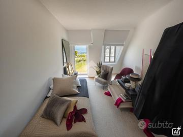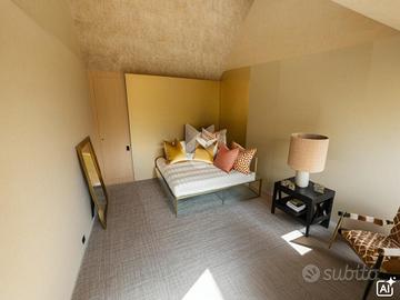 Il piano superiore, collegato tramite una scala esterna, ospita altre due camere da personalizzare secondo le proprie esigenze e un'area attrezzata con gli attacchi per la realizzazione di un secondo bagno. Dal secondo livello si accede a un balcone, da cui si può godere di una splendida vista sulle colline circostanti.