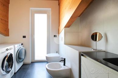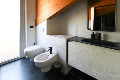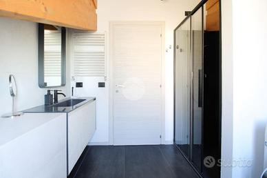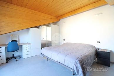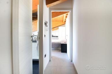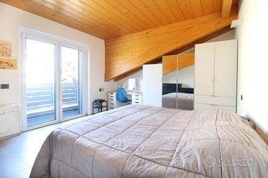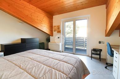 Attraverso una scalinata interna si accede alla zona notte con soffitti impreziositi da travi a vista in legno, che conferiscono calore e carattere agli ambienti, dove troviamo una camera matrimoniale con accesso al balcone ed un bagno con box doccia anch'esso servito da balcone.