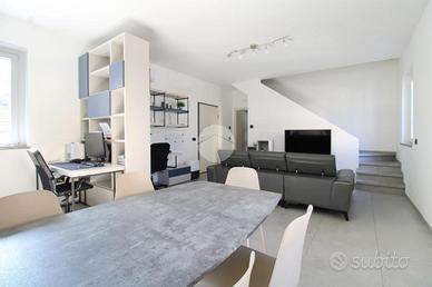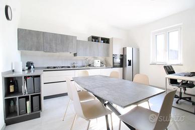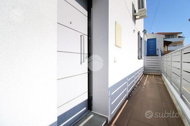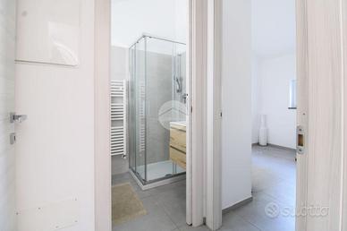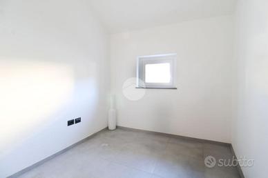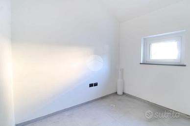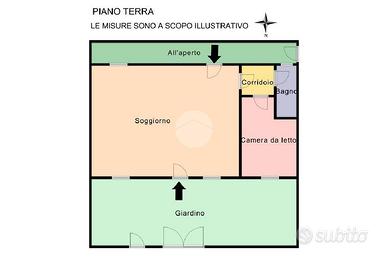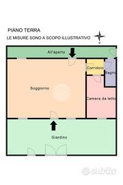 Tramite un'ampia corte esterna si accede al piano terra, dove troviamo un'ampia e luminosa zona living open space con cucina abitabile, ed un secondo ingresso con accesso ad un'ulteriore corte esterna. Un comodo disimpegno ci accompagna alla cameretta e ad un bagno finestrato con box doccia.