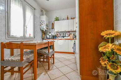 L'appartamento al primo piano misura circa 115 mq ed è così composto: soggiorno, cucina abitabile, bagno, tre camere da letto e ripostiglio.