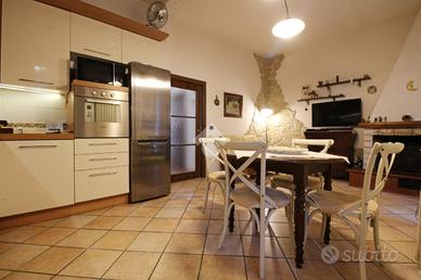 L'ampia cucina abitabile, con il suo camino in muratura, è il vero cuore della casa, da qui si accede alla resede tergale che offre invece uno spazio perfetto per cene o pranzi, dotato di barbecue per trascorrere momenti di tranquillità all'aria aperta.