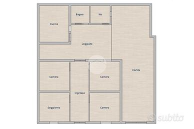 L'unità è composta da: soggiorno, cucina abitabile con camino, tre camere e due bagni. Caratteristica principale dell'immobile è il cortile con ingresso carrabile, ideale per trascorrere momenti all'aperto in totale tranquillità.