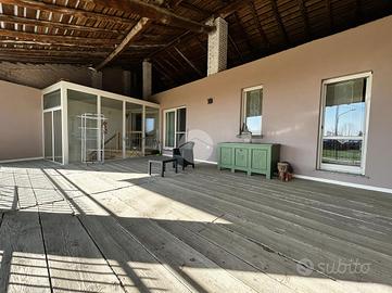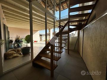 Una scala esterna, visibile grazie a una vetrata, conduce alla zona notte al primo piano, dove un secondo bagno finestrato, dotato di vasca idromassaggio, offre un ulteriore tocco di comfort. La zona notte è composta da una stanza adibita a guardaroba che collega le tre camere da letto: due matrimoniali e una doppia, con accesso a un ampio terrazzo che si affaccia sul cortile interno della cascina.