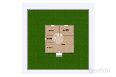 La soluzione descritta è posta su un piano rialzato e si sviluppa su un unico livello. All'interno la casa dispone di un accogliente soggiorno, un angolo cottura, due camere da letto matrimoniali ed un bagno completo di box doccia e finestra. Gli spazi sono ottimizzati e ben disposti. Inoltre sono presenti climatizzatori per il condizionamento dell'aria.