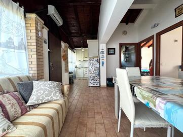 La soluzione descritta è posta su un piano rialzato e si sviluppa su un unico livello. All'interno la casa dispone di un accogliente soggiorno, un angolo cottura, due camere da letto matrimoniali ed un bagno completo di box doccia e finestra. Gli spazi sono ottimizzati e ben disposti. Inoltre sono presenti climatizzatori per il condizionamento dell'aria.