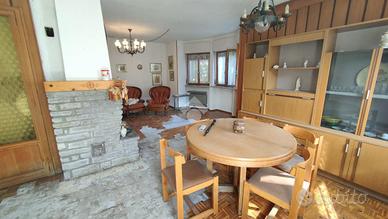 Al piano terra-rialzato, invece, vi è un grande atrio di ingresso dal quale si accede a tutti i vari ambienti della casa: un soggiorno doppio con camino a vista, da cui, tramite porta scorrevole, è possibile accedere alla cucina abitabile. Sullo stesso piano, vi sono anche tre camere da letto matrimoniali servite da balcone e un bagno con uscita diretta sul terrazzino.
