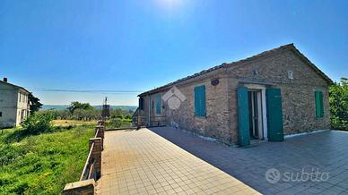 Saludecio: tipico casolare rustico delle campagne romagnole, assolutamente unico nel suo genere, immerso in un panorama da cartolina: al piano terra cinque ampi depositi/cantine per complessivi 128 mq commerciali perfetti per garage, laboratori o spazi ricettivi; al piano primo l'abitazione si sviluppa su sei locali, con tre camere da letto e tre grandi ambienti giorno ideali per accogliere ospiti o creare ambienti living su misura.