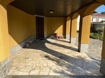 Il porticato al piano terra di 25 mq circa, esposto a Sud verso il giardino, utile anche da utilizzare per piacevoli momenti di relax della famiglia e con amici, si accede all'abitazione dotata di un vano scala di collegamento ai due appartamenti e porta di collegamento ad un ampio locale ad uso box / ripostiglio di 27 mq.