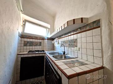 un pied a terre diviso tra soggiorno d'ingresso con particolare credenza a muro e ampio ripostiglio, ideale da adibire a zona notte, l'angolo cottura in muratura, finestrato e riservato e bagno completo di doccia.