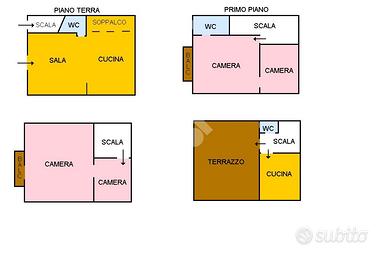 Il primo immobile è composto da un vano di ingresso, un secondo vano adibito a cucina e wc al piano terra; e da due vani, balcone e wc al primo piano, per una superficie catastale complessiva di mq 58.
