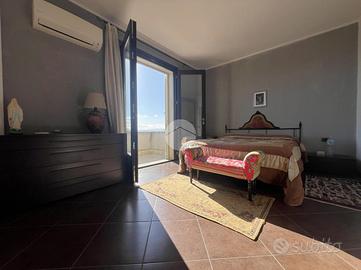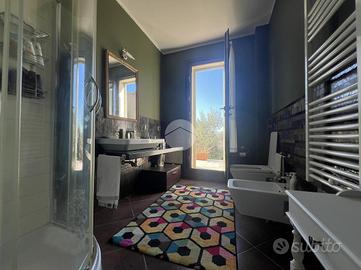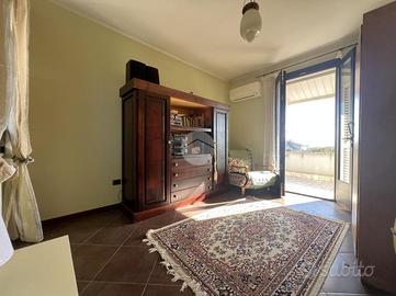 Il piano superiore, cui si accede tramite una comoda e funzionale scala interna, si compone di due camere da letto, una matrimoniale ed una singola, entrambe con affaccio su un ampio terrazzo con vista panoramica sul verde e paesi limitrofi. Completa il piano un bagno con doccia che consente l'accesso ad un secondo balcone.