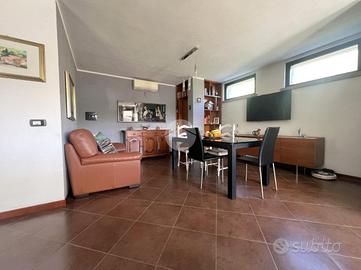 Al piano terra ci accoglie un ampio e luminoso open-space, servito da due porte finestre che affacciano sulla veranda ed un bagno finestrato con doccia.