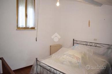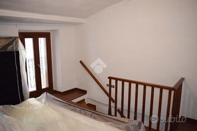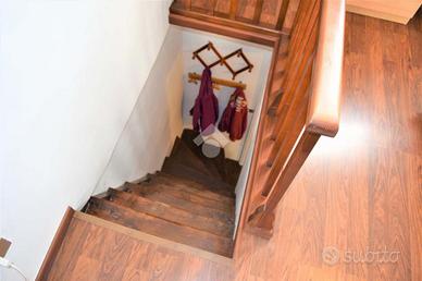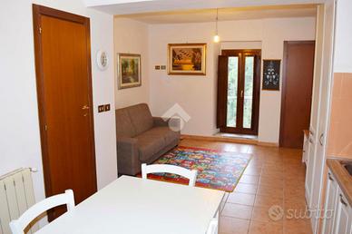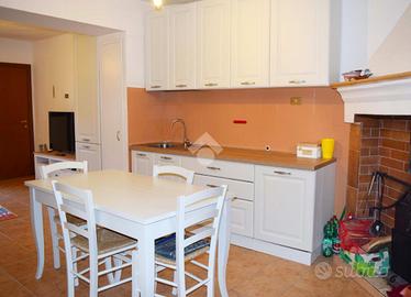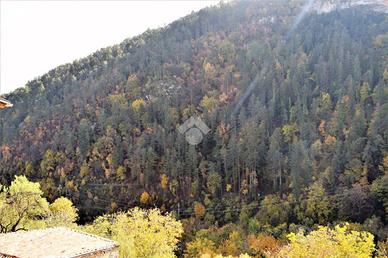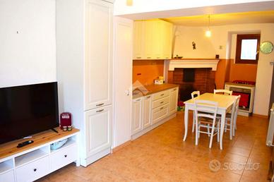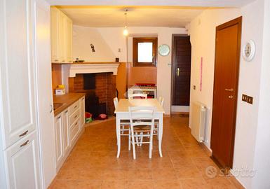 Al piano terra troviamo il soggiorno con l'angolo cottura e il camino, bagno di servizio e balcone panoramico; al piano primo ampia camera con balcone, anch'esso con vista sulla pineta. Al piano seminterrato altro ingresso, camera, bagno e cantina. La casa è in buono stato e conserva il fascino storico con un tocco di modernità.