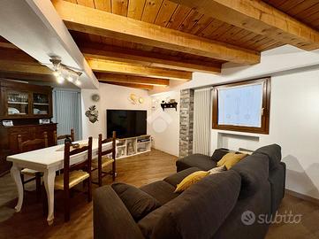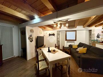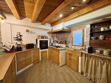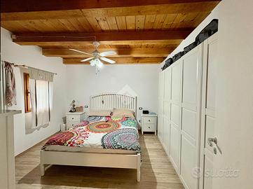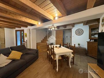 Dal portico d'ingresso si accede all'abitazione, dove si apre un'ampia zona giorno , composta da un accogliente soggiorno con spazioso angolo cottura, caratterizzato da soffitto con travi a vista che dona autenticità all'ambiente. Un bagno di servizio e un ripostiglio da adibire a lavanderia completano il piano terra.