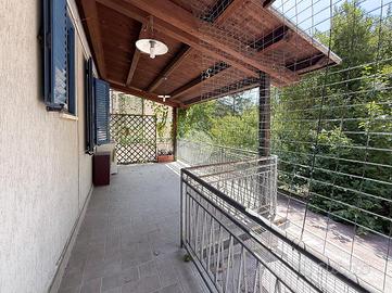 Salendo al primo piano, ci accoglie un ampio soggiorno con camino, affiancato da una comoda cucina. Anche qui la zona notte è ben distribuita, con tre camere da letto, una delle quali si apre su un grande balcone coperto da una tettoia in legno. A servizio del piano un ulteriore bagno finestrato con doccia.