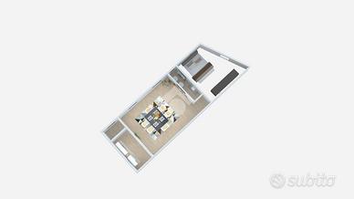 Al primo piano l' abitazione accoglie con un ampio soggiorno con cucinino, 1 camera da letto e bagno con doccia.