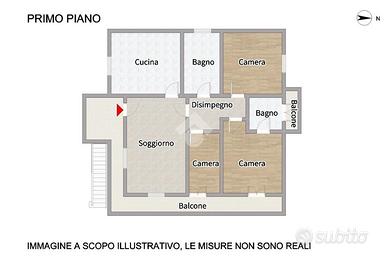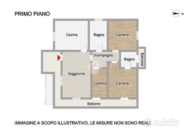 Piano Primo: l'unità si compone di un ampio soggiorno, una cucina abitabile, tre camere da letto (due matrimoniali e una doppia), oltre a doppi servizi.