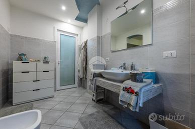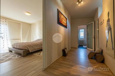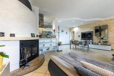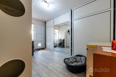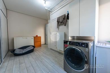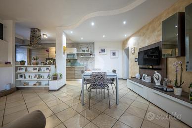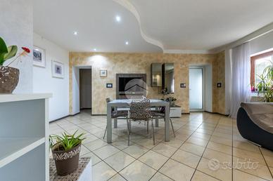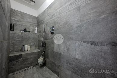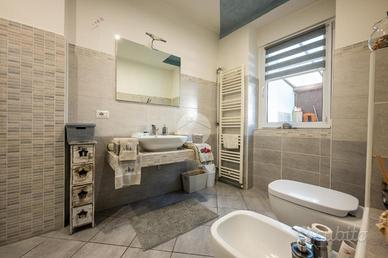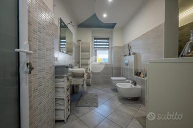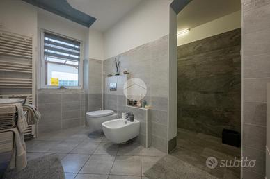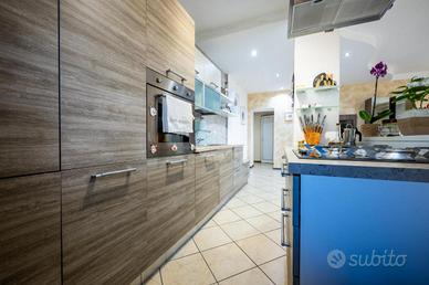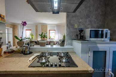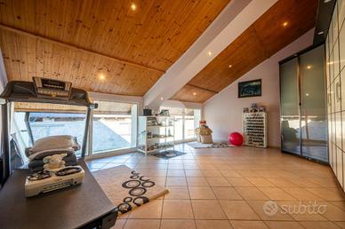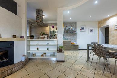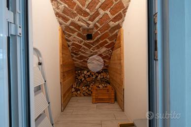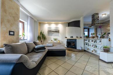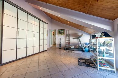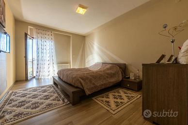 L'ingresso avviene sul disimpegno che divide il piano terra dal piano primo, tramite porta si accede al soggiorno dotato di caratteristico termocamino a legna e angolo cottura, il tutto è impreziosito dalle innumerevoli finestre che danno luminosità e calore all'ambiente. Dalla zona giorno troviamo un disimpegno dal quale prendono sfogo un ripostiglio, un bagno finestrato con doccia fatta in pietra, quest'ultima è stata arricchita con un vortice di aspirazione per far si che l'ambiente sia sempre sano e una camera utilizzata principalmente come locale lavanderia e cabina armadio. Tramite la scala interna accediamo alla zona notte, prende sfogo una prima camera da letto con tetto a vista, ampi finestroni che danno luce e di discrete metrature, da un secondo disimpegno prendono sfogo altre due camere da letto matrimoniali con sfogo sul balcone comune e un bagno dotato di box doccia con finiture di pregio.