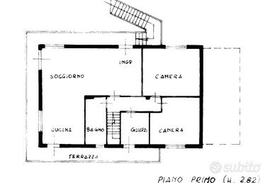 L'acceso all'abitazione avviene mediante la scala esterna che porta al primo piano dove ci accoglie un luminoso ingresso alla destra del quale troviamo la zona giorno composta di cucina e soggiorno openspace con doppio accesso alla terrazza che percorre tre lati dell'immobile.