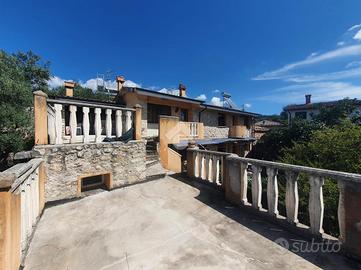 Al piano terra: ingresso, luminoso soggiorno, cucina abitabile con dispensa, camera da letto, bagno e un suggestivo locale rustico completo di cucina in muratura, ripostiglio, forno a vista, lavanderia e ulteriore bagno, perfetto per convivialità e momenti in famiglia. Al primo piano: ampio disimpegno da adibire secondo le proprie esigenze, due comode camere da letto, bagno e accesso a balconi panoramici e a una doppia terrazza che regala scorci suggestivi sul paesaggio circostante.