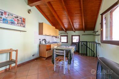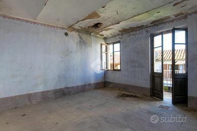 Il primo corpo è stato di recente ristrutturato e si compone al piano terra di un piccolo vestibolo che mette in comunicazione il bagno dotato di doccia e finestra con la parte abitativa al piano superiore composta da un solo locale con angolo cottura. Il soffitto presenta una copertura con travi in legno a vista. Infine abbiamo un ampio garage con porta basculante che si apre sul cortile interno.