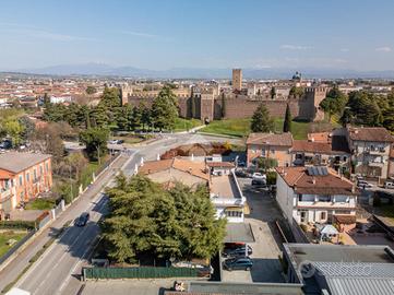 Villafranca di Verona - posizionata in zona strategica, dietro il Castello Scaligero di Villafranca, proponiamo in vendita soluzione indipendente dotata di giardino privato angolare di 234,00 mq. L'immobile si sviluppa su due livelli fuori terra e si compone di ingresso, il quale conduce alla zona soggiorno di 19,00 mq, collegata alla taverna/cucina di ulteriori 19,50 mq, da qui è possibile accedere al giardino posto sul fronte dell'abitazione, introvabile zona verde in pieno centro, ideale per piacevoli momenti all'esterno senza rinunciare alle comodità ed ai servizi offerti in zona. Proseguendo verso il piano primo troviamo ulteriori 86,00 mq attualmente utilizzati come due camere matrimoniali da letto di rispettivamente da 15,20 mq e 14,00 mq, servite da ulteriore bagno ed ulteriore zona soggiorno con cucinotto. Completa al piano terra un garage singolo di 16,00 mq. Soluzione unica nel suo genere, vista la pozione centrale, le metrature del giardino e la versatilità della soluzione.