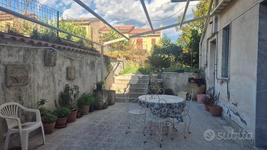 La casa: su due livelli collegata internamente da scala. Al piano terra due vani spaziosi,Oltre un altro vano di passaggio, cucina e bagno, tutto il piano ha esposizione sul cortile interno, collegato direttamente al giardino, per un totale di spazio esterno di circa 176 mq al piano terra; al piano primo stessa composizione e ambienti del piano terra, balconato su tre esposizioni, la copertura è con lastrico solare panoramico. La struttura risale ai primi anni '70, oggi si presenta in buone condizioni ma da rivedere soprattutto gli impianti e i bagni, gli infissi in buone condizioni in legno monovetro. E' possibile creare garage nel primo vano su strada al piano terra, ha già una apertura carrabile.
