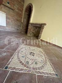 La struttura è decorata con pietra a vista sulle linee verticali e con piastrelle di uno splendido cotto ceramico ed illuminazione sulle scale che portano al primo piano ad ogni gradino. Tutto l'ambiente è poi decorato dalla presenza di un camino.