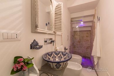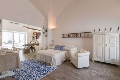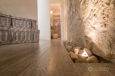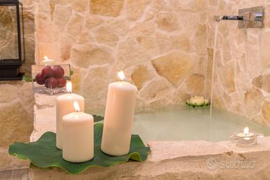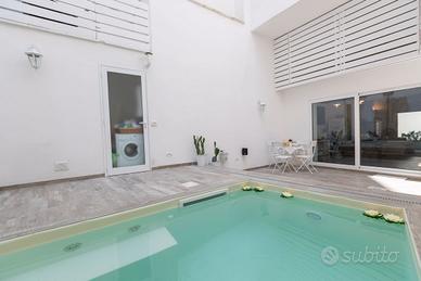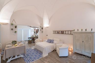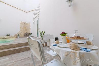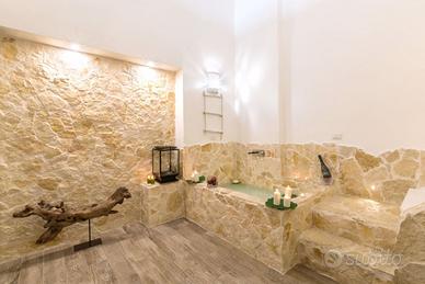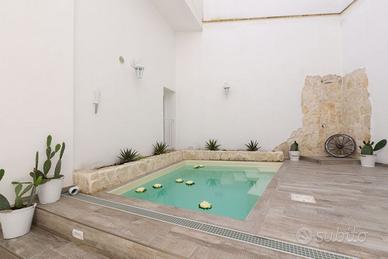 CENTRO: si propone in locazione lussuoso appartamento indipendente situato nel centro storico della città posto al piano terra. L'abitazione si compone di un ampio e splendido open space luminoso, con tipiche ed alte volte originarie. La cucina è completamente abitabile ed accessoriata di lavastoviglie, lavatrice e frigorifero Smeg vintage, cucina ad induzione e dotata di ogni confort: una penisola alla americana con n. 3 sgabelli permette di consumare snack e colazioni veloci, mentre un tavolo Maison du Monde con 4 sedie è ideale per pranzi e cene. L'open space ospita un pregiato divano letto in pelle (materasso 12 cm di spessore) e due poltrone capitonnè. Attraverso un'ampia porta finestra si accede al giardino d'inverno interno all'appartamento e completamente riscaldato in cui ha sede la piscina, anch'essa riscaldata, dotata di idromassaggio, cromoterapia e comodi scalini per un agevole ingresso in acqua. Si tratta di una vera e propria spa ad uso personale, fruibile tutto l'anno grazie alla coibentazione termica del cortile che la ospita coperto da una termo tenda ad apertura motorizzata che isola il calore. Il giardino è altresì riscaldato da un "fungo" a gas. L'appartamento è dotato di impianto stereo con casse acustiche. Il primo dei bagni (in stile orientale) ospita una doccia emozionale ricavata nella roccia con cromoterapia. Attraverso un elegante corridoio rivestito di pietra locale ed illuminato con luce soffusa si accede ad una seconda stanza indipendente uso cabina armandio. A seguire vi è una stanza relax con splendida vasca in roccia e piccolo camino a bioetanolo. Dalla "sala vasca" si accede al secondo bagno ensuite dotato anch'esso di doccia walk in roccia e cromoterapia. L'appartamento è riscaldato in modo autonomo ed è dotato di n. 3 climatizzatori Ferroli inverter, due TV e connessione wi-fi. I mobili e le suppellettili sono tutti di pregio, restaurati ed orginari di antiche masserie tipiche locali. P