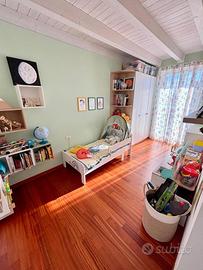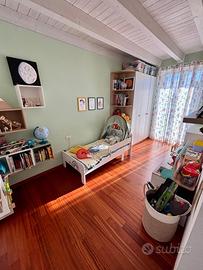 La casa si dispone su due livelli abitativi, al piano terra troviamo un'ampia zona living, con comodo affaccio sul giardino, composta da sala, cucina, bagno, ripostiglio e scala di collegamento al piano primo composto da camera matrimoniale, ampia cameretta, bagno e terrazzo.