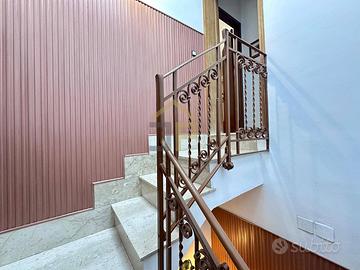Tramite scala in marmo si accede al primo piano dedicato alla zona notte con quattro confortevoli camere da letto, un riposto ed un bagno funzionale con vasca; offrendo così comfort e privacy.