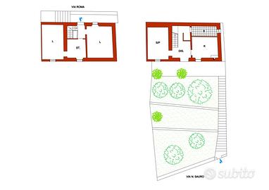Abitazione indipendente articolata su due piani con doppio ingresso sia dalla parte alta (Via Roma), che dalla parte bassa (Via Sauro). La superficie lorda e di circa mq. 75 per piano, la distribuzione interna è composta da un totale di n° 5 vani ed un bagno, inoltre è presente una soffitta ispezionabile ed utilizzabile come deposito. L'edificio ha un giardino di pertinenza di circa mq. 200. Impianto di riscaldamento a gas con possibilità di allaccio alla rete pubblica. Dalle finestre del piano primo si può ammirare il panorama cittadino. L'intero immobile ricade in zona di completamento residenziale con volumetria residua per sviluppare eventuale nuova progettualità. Parcheggio per le auto, pubblico e gratuito sempre disponibile.