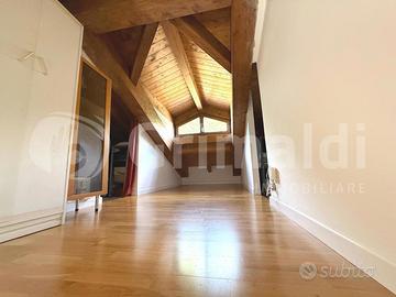 Soffitta rifinita con travi in legno a vista, con altezza massima di 2,20 m e minima di 0,55 m.
