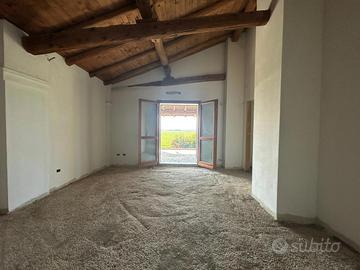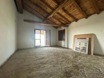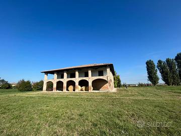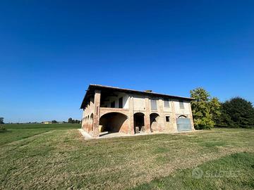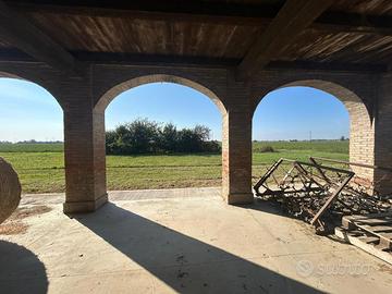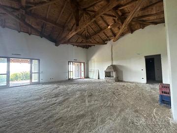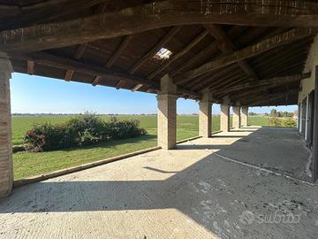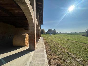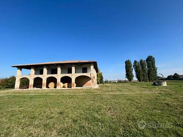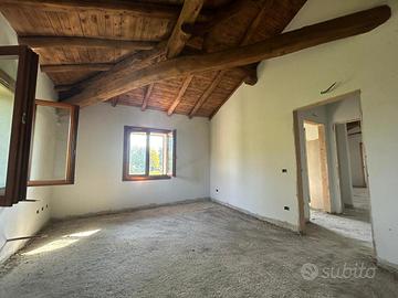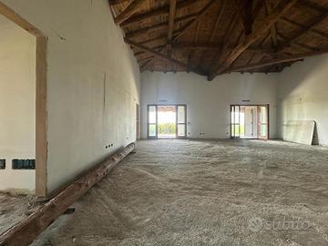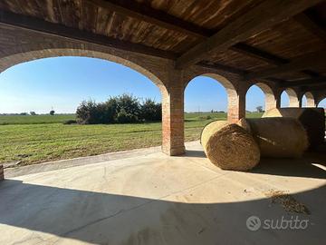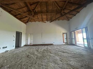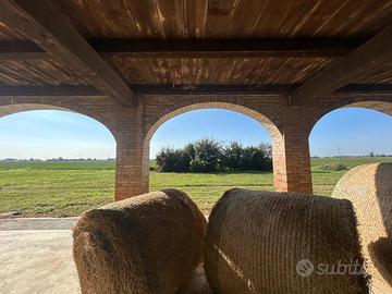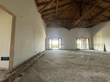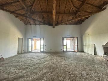 L'unità principale, caratterizzata da travi in legno a vista, si sviluppa al primo piano ed è composta da un'ingresso su un salone di 77 mq con camino ed accesso al meraviglioso terrazzo loggiato di oltre 90 mq, con una splendida vista su una distesa verde dei campi circostanti, uno spazio esterno perfetto per godere della tranquillità e del paesaggio naturale in ogni stagione.