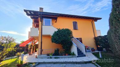 -INTERA VILLA BIFAMILIARE - CON GIARDINO, TERRAZZO E AMPIO BOX - In contesto moderno e tranquillo proponiamo in vendita una splendida villa bifamiliare composta da due abitazioni entrambe con ingresso indipendente. L' immobile al piano terra si compone di un soggiorno con cucina a vista, tre camere da letto e due bagni entrambi finestrati, con box doccia. Al piano primo, invece, si sviluppa la seconda unità abitativa, composta da un soggiorno con cucina separata e accesso ad un terrazzino sfruttabile, tre camere da letto, due bagni e due balconi che donano luminosità a tutti gli ambienti. Inoltre, il piano interrato ospita un ampio box con capienza 3 / 4 autovetture, una lavanderia e una cantina offrendo spazi accessori di notevole utilità. Completano la proprietà un curato giardino e un ampio terrazzo, perfetti per trascorrere momenti di relax all' aria aperta. Questa soluzione rappresenta la perfetta combinazione tra indipedenza, funzionalità e comfort abitativo grazie al riscaldamento a pavimento e all'impianto fotovoltaico. Ideale per due famiglie che vogliono vivere con tutti i comfort moderni, e spazi esterni vivibili.