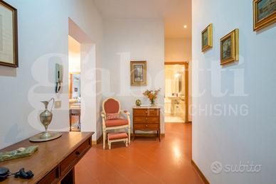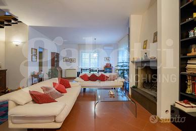 L'ingresso conduce a un elegante e luminoso salone con camino, affiancato da una cucina con tinello, una camera e un bagno. Tutti gli ambienti del piano terra sono dotati di porte finestre che garantiscono un accesso diretto al giardino, creando una piacevole continuità tra interno ed esterno. Completano il piano terra uno studio, un bagno, una cantina e un'autorimessa, ambienti dai quali è possibile realizzare un bilocale con ingresso indipendente. Il piano primo ospita la zona notte con quattro ampie camere da letto, una comoda stanza guardaroba, due bagni, un ripostiglio.