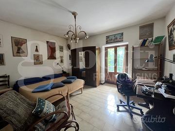 Soluzione a schiera con al piano primo soggiorno con terrazzo, cucina abitabile con camino, 2 camere e bagno. Al piano terra 2 fondi rifiniti di cui uno con camino e wc. Veranda e giardino privato. Terreno distaccato di circa 1 ha. Classe Energ. G