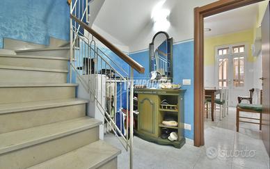 La proprietà principale, di circa 130 mq commerciali, si sviluppa su tre livelli abitativi, oltre a cantina nel seminterrato e sottotetto. L'ingresso al piano terra si apre su una spaziosa zona giorno, composta da soggiorno e cucina abitabile. Al primo e secondo piano si sviluppa la zona notte, con un totale di tre camere da letto e due bagni, questi recentemente rinnovati, e un balcone esposto ad ovest, comodo e suggestivo sfogo esterno dalla principale camera da letto. Il sottotetto offre ulteriore spazio utile come deposito o potenziale area da valorizzare. La cantina al piano seminterrato rappresenta una comoda pertinenza, utile per lo stoccaggio o come locale tecnico.