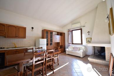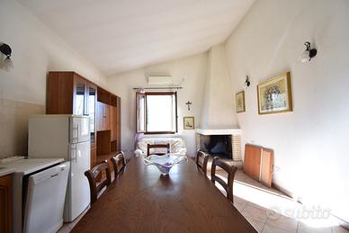 Si accede all'immobile da una veranda coperta che ci conduce alla zona giorno, un spazioso open space con caminetto ben illuminato da due ampie finestre.