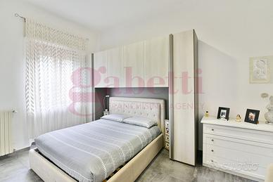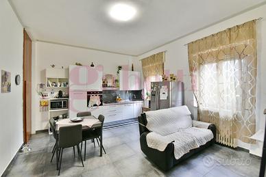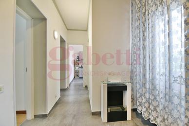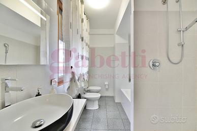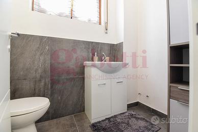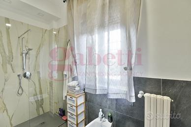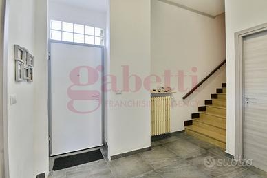 Comoda scala di collegamento che conduce al piano primo dove troviamo un ampio soggiorno con cucina separata, una camera matrimoniale con bagno completo di vasca e box doccia ed un ulteriore bagno di servizio.