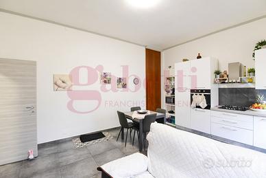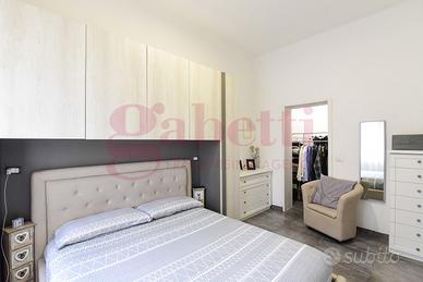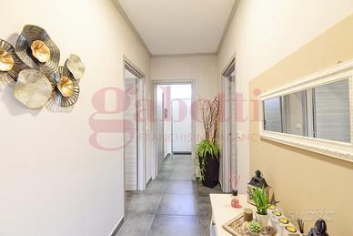 La soluzione al piano terra con doppio ingresso, è composta da soggiorno ampio con cucina a vista, disimpegno, camera matrimoniale con cabina armadio, bagno con box doccia e una lavanderia.