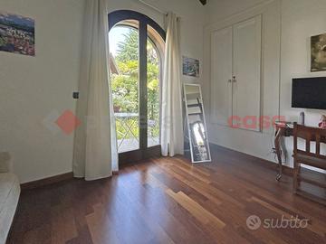 L'immobile ha un doppio accesso, dalla strada principale dove l'ingresso avviene tramite un passo carraio con cancello elettrico e un cancelletto pedonale che portano al giardino con alberi da frutto. Tramite una scala in granito, si accede al giardino panoramico di circa 600mq dal quale vi è l'accesso alla zona giorno, che è composta da soggiorno con camino a ventilazione forzata, cucina in muratura con affaccio sul giardino con barbecue, veranda chiusa e riscaldata per l'inverno, ripostiglio e un bagno. Al primo piano troviamo la zona notte, composta da una camera matrimoniale con terrazzo vista lago, seconda camera con balcone e armadio a muro, bagno con doccia.