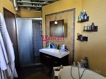 Salendo al primo piano tramite una scala interna e indipendente, si accede ad un'ampia cucina abbinata ad uno spazioso soggiorno. Da quest'area si può uscire su un balcone porticato, molto ampio, ideale per momenti di relax o convivialità. La zona notte, separata da un disimpegno, comprende una camera matrimoniale con bagno esclusivo e box doccia, un'altra camera matrimoniale e il secondo bagno, attrezzato con vasca idromassaggio e box doccia.