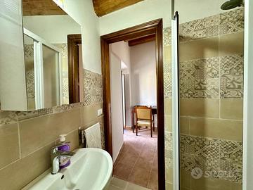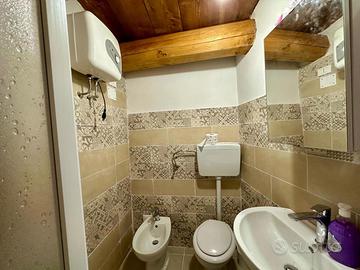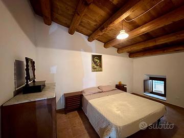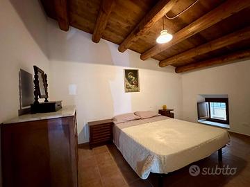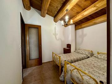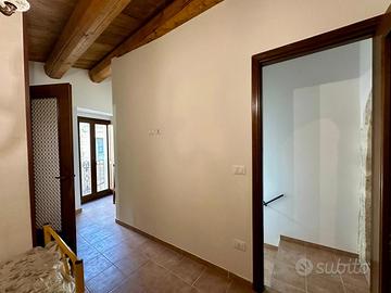 Una comoda scala ci conduce al primo piano dove troviamo una camera matrimoniale, una cameretta e bagno con doccia , il tutto rifinito con tetto in legno a vista.